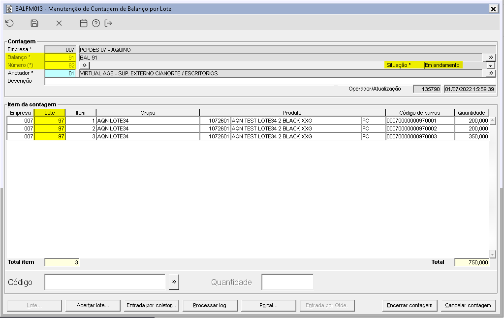 Foi requisitada a implementação da validação quando o usuário tentar alterar a um item de lote que esteja em balanço em andamento com contagem válida.