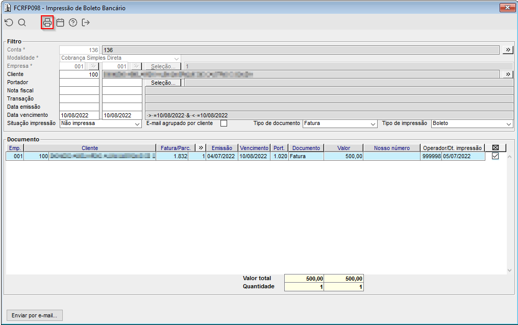 Imagem 3 - Demonstra o componente FCRFP098, onde está sendo selecionada a fatura 1832. Em seguida o botão de impressão está sendo acionado.