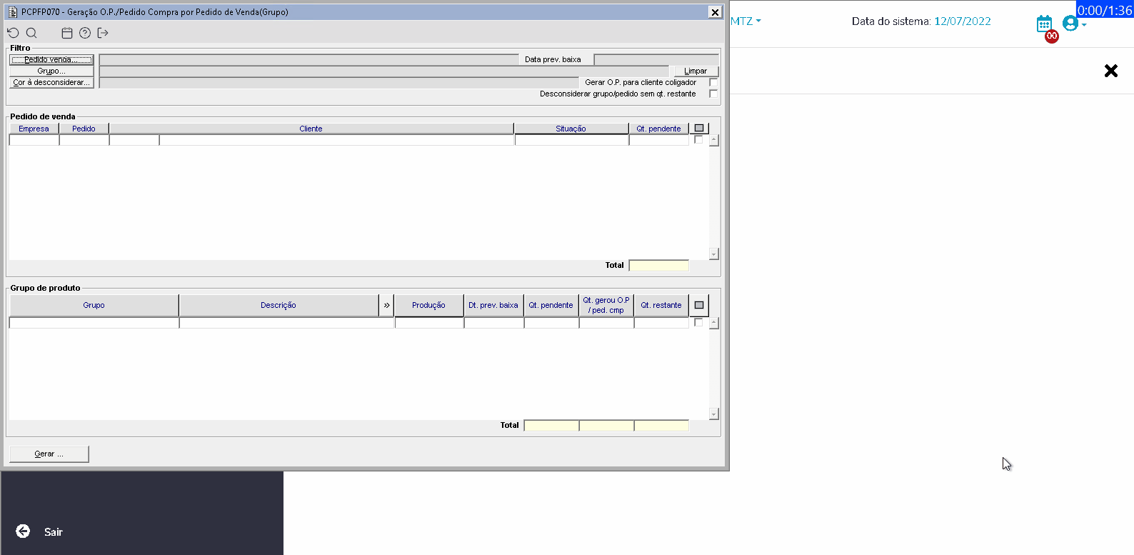 Imagem 1 - No componente CMPFP039, quando o usuário alterar a quantidade do pedido de compra, será demonstrada uma mensagem informando o mesmo que as quantidades geradas para cada um dos pedidos de origem continuará sendo a original, e será gravada no campo "Qt. gerou O.P./ped. cmp" o valor do item do pedido de venda.