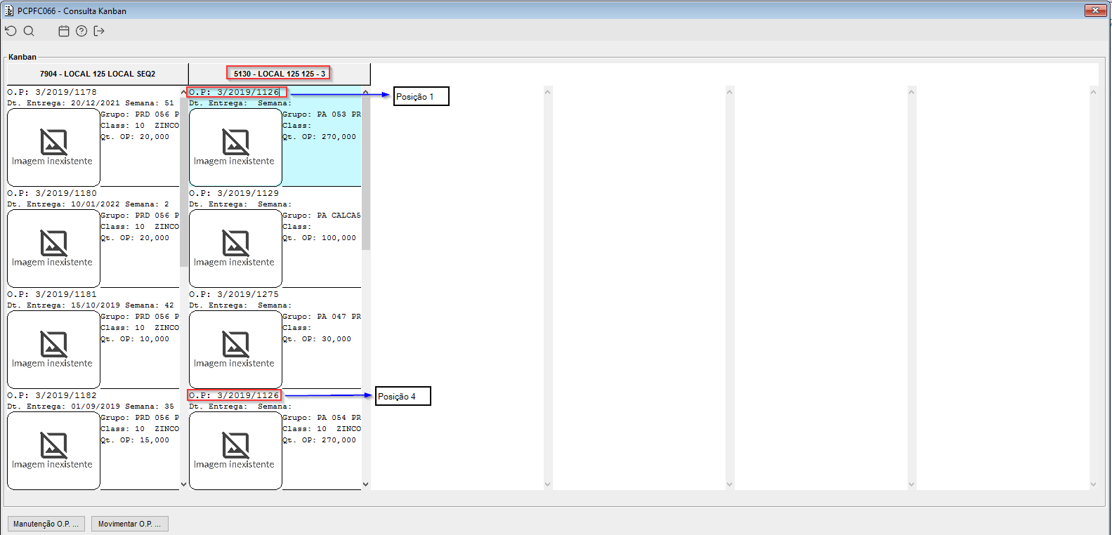 No caso de exibição de apenas uma célula por O.P., definida pela configuração de exibição do kanban (PCPFM260), a O.P. deve receber a menor sequência para o local entre todos os grupos.