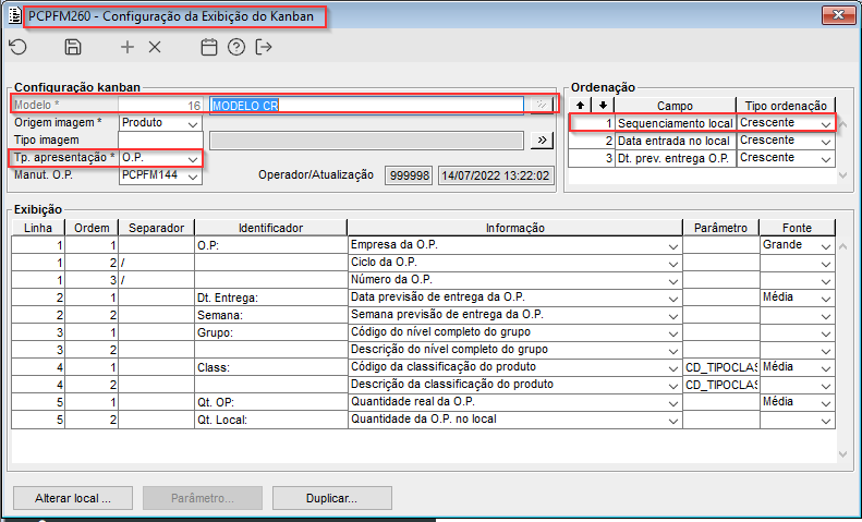 Imagem 1 - Modelo (16) de configuração de exibição do kanban, definido com apresentação por grupo de O.P. e ordenação crescente por sequenciamento de local como prioritária.