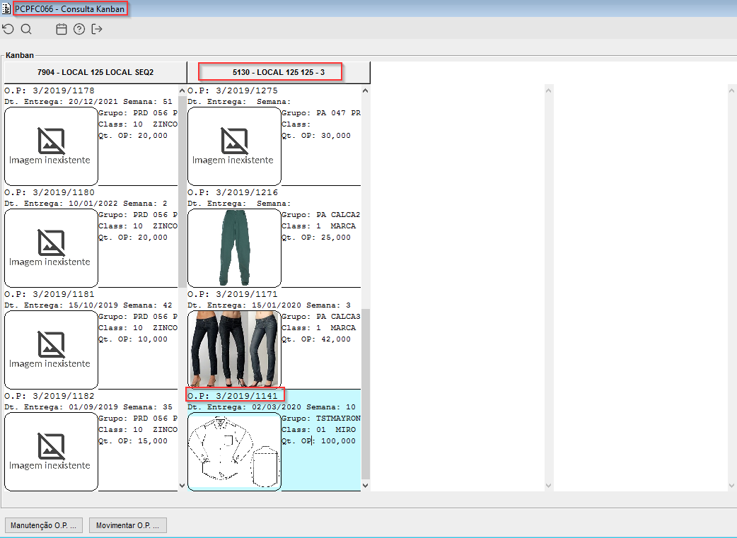 Imagem 2 - Local (5130) configurado com o modelo (16) de configuração de exibição do kanban.