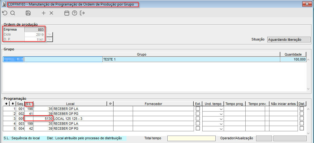 Imagem 7 - A O.P. (1126), grupo (PA 054), está sequenciada no local (5130) na posição 4.