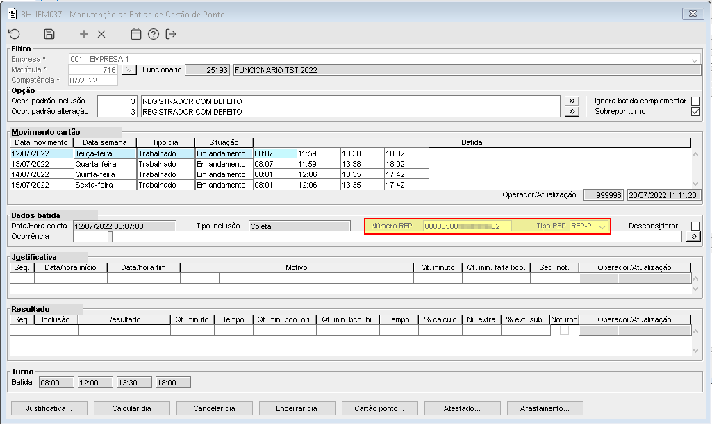 Imagem 3 - Após a importação do arquivo coletado pelo RHUFP100 no RHUFP002, na batida do funcionário consta o número e tipo de REP informado no cadastro do relógio ponto no RHUFM179.
