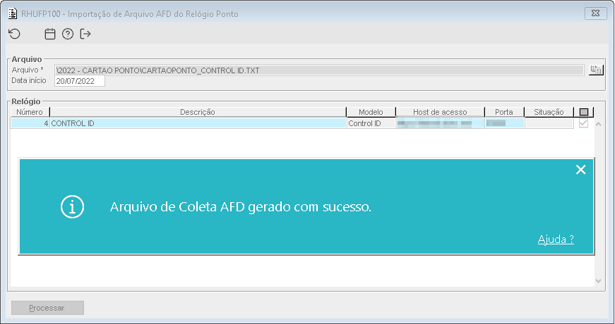 Imagem 2 - Importação do arquivo de coleta do cartão ponto pelo RHUFP100.