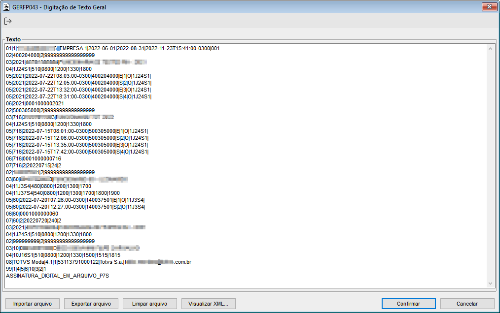 Imagem 3 - Acima vemos os registros 01 a 08, registro 99 e assinatura digital, gerados polo componente RHUFP018.