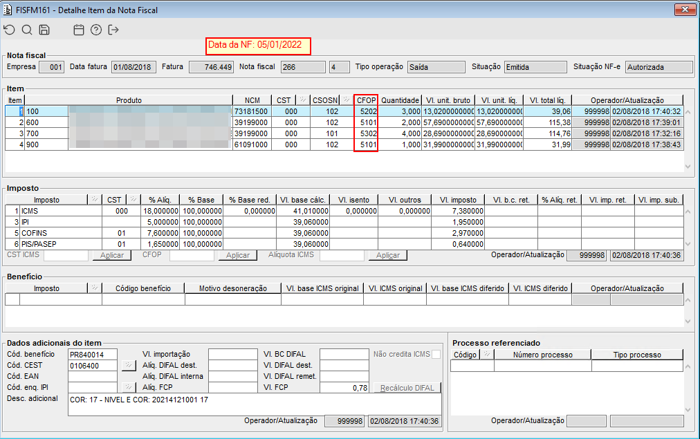 Imagem 3 - Demonstração da configuração dos dados a serem gerados nos registros C195 e C197 dos documentos com o CFOP 5101 em questão.