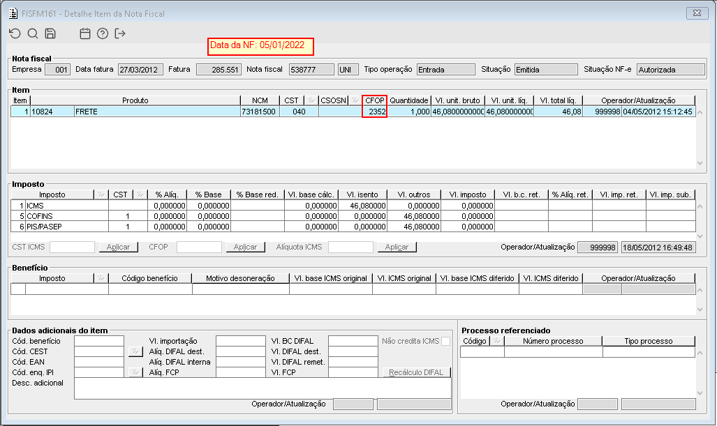 Imagem 7 - Demonstração da configuração dos dados a serem gerados nos registros D195 e D197 dos documentos com o CFOP 2352 em questão.