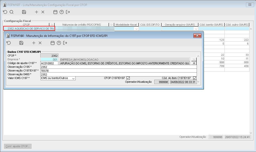 | Função: | FISFM107/FISFP017 - Configuração para geração dos registros C195/D195 e C197/D197 no Sped ICMS/IPI por CFOP |