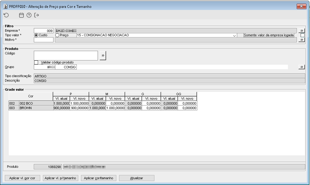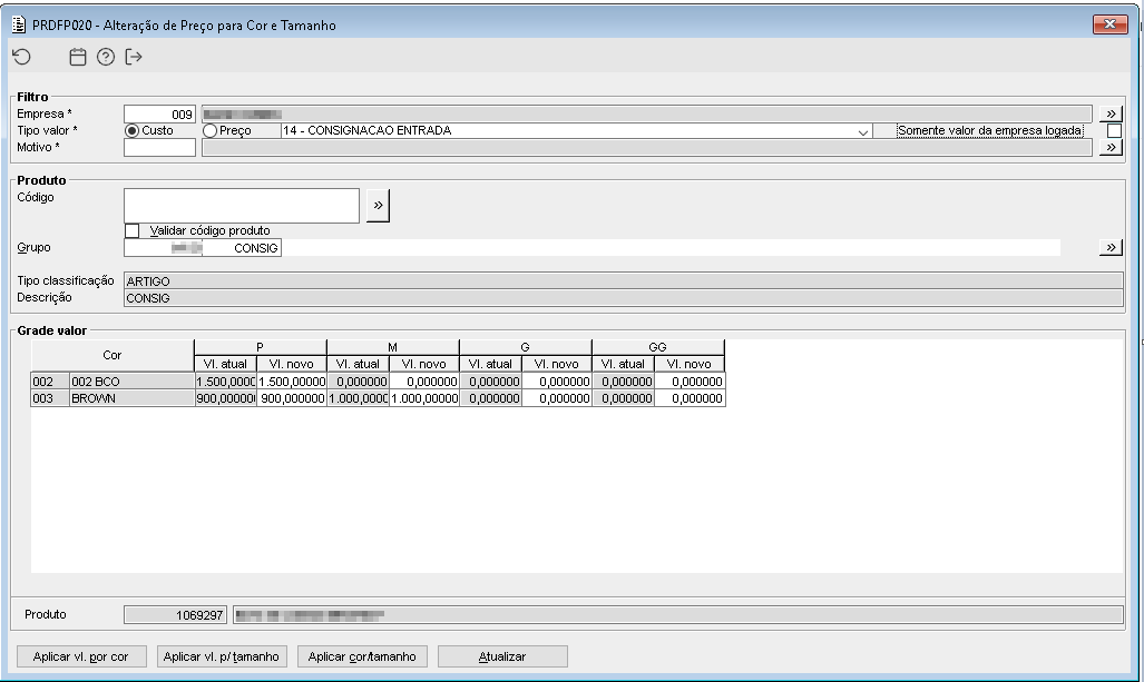 Imagem 5 - Foi atualizado o preço de custo dos produtos 1069297, 1069298, utilizados na transação de entrada de consignação de acordo com o que foi informado no parâmetro empresa da imagem 1.