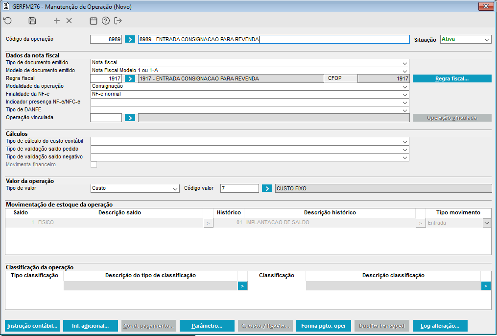 Imagem 3 - Operação que será utilizada na transação de consignado, pode ser observado a modalidade Consignação, com a regra fiscal com a CFOP 1917 quando for dentro do estado, fora do estado a CFOP será a 2917.