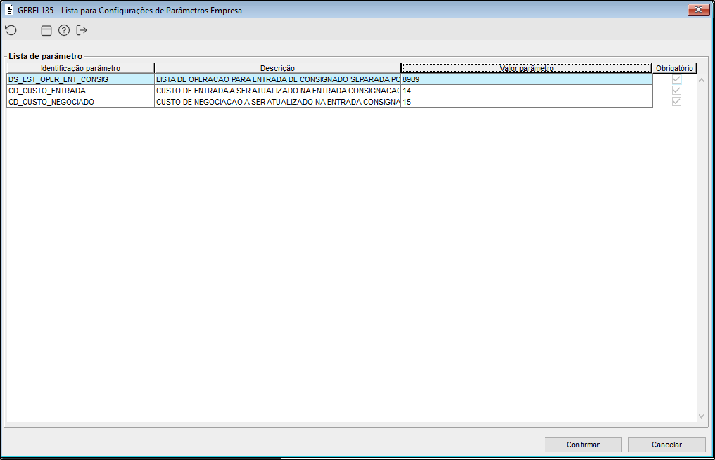 Imagem 1 - Parâmetro empresa onde pode ser informado a lista de operação para entrada de consignado e os códigos de custo do produto para sofrer alteração na transação de entrada de consignado. Para acessar o parâmetro, basta acionar o duplo clique ou um clique no botão de pesquisa.