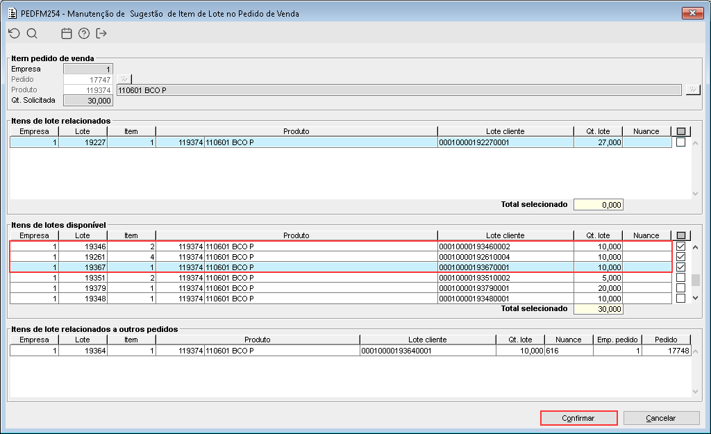 Imagem 02 - Ao acionar o botão mencionado anteriormente, o componente PEDFM254 é apresentado, onde está sendo listados os itens de lote relacionados, os disponíveis e os que estão relacionados a outros pedidos de venda. Em seguida está sendo selecionado três itens disponíveis e acionado o botão "Confirmar".