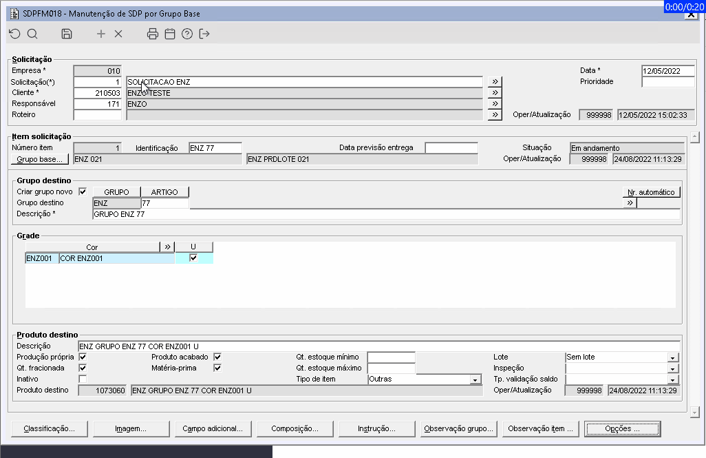 Imagem 1 - Ao possuir grupo base e grupo destino gravado, navegar através do botão "Opções..." → "Serviço por grupo...", será aberto o componente PCPFL086, com o grupo carregado, sendo possível realizar manutenção dos valores de serviço para esse grupo.