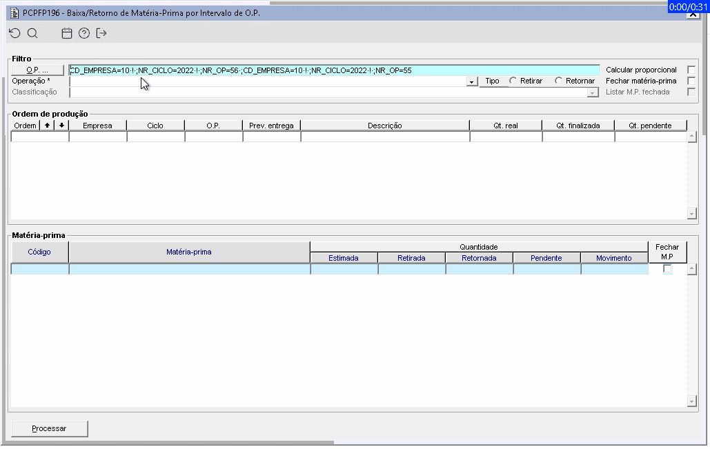 | Função: | Permitir retorno de MP no PCPFP196 sem obrigar abertura do fechamento de MP |
