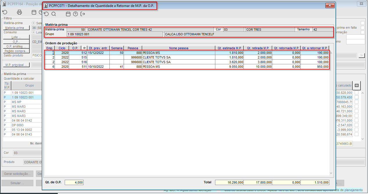 No componente PCPFP164 deve ser possível detalhar corretamente o número constante na coluna "Retornar" de cada material.