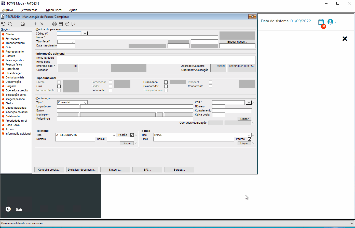 Gif 1 - Acima é possível ver a tela do PESFM010 inserindo uma inscrição estadual com 11 dígitos e gravando a inclusão.