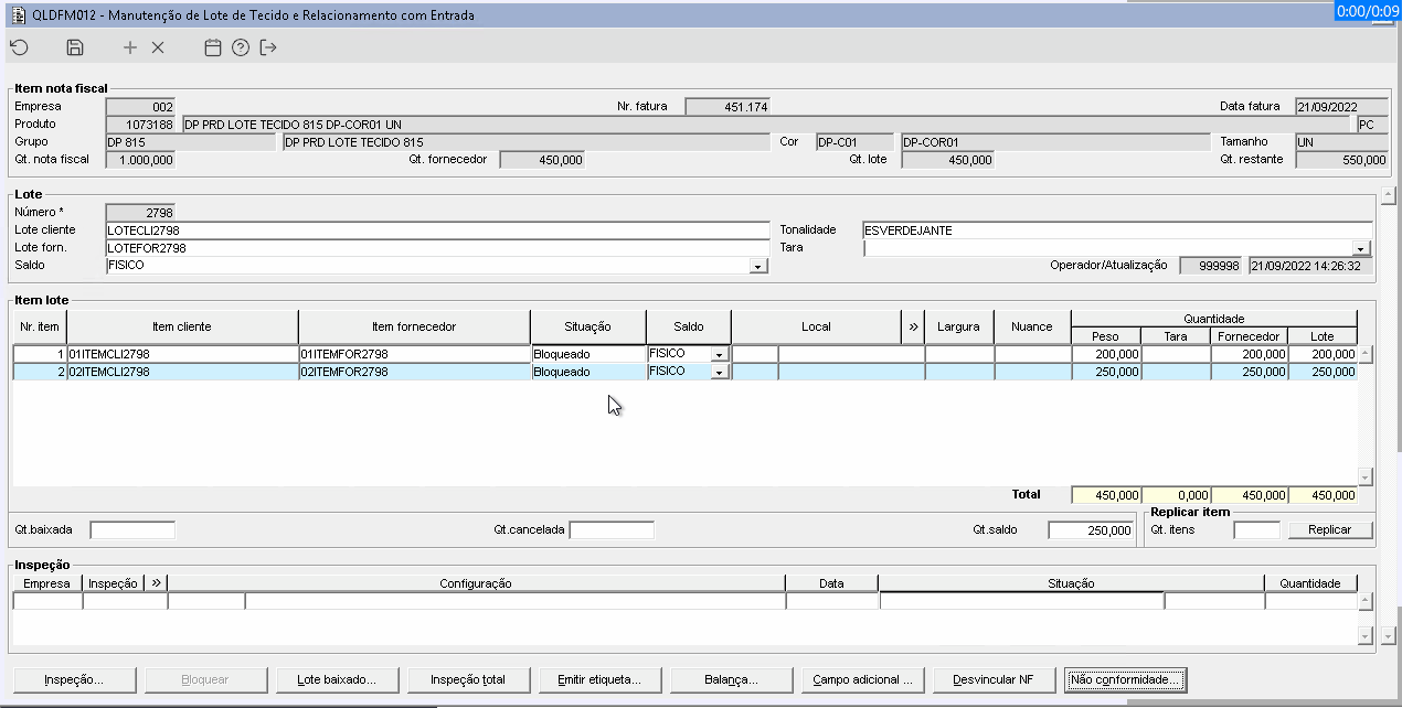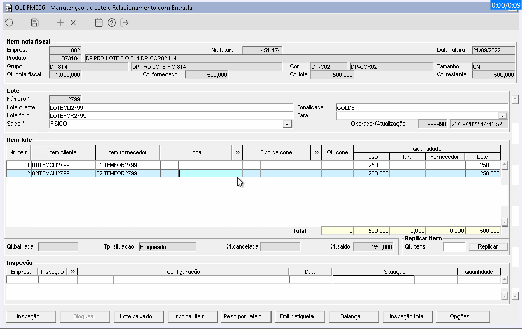 Os componentes QLDFM006 e QLDFM012 são chamados a partir do componente QLDFP023 e podem ser utilizados para gerar itens de lote a partir do produto da fatura filtrada. Caso o usuário identifique alguma inconformidade no item que foi gerado é necessário acionar o QLDFM020 e filtrar o item de lote para cadastrar a inconformidade encontrada.