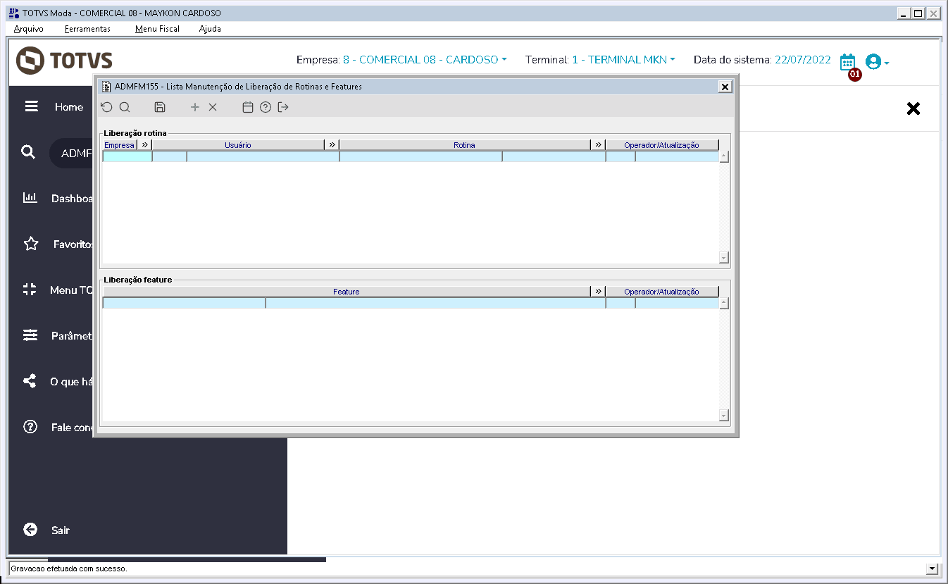 Gif 01 - Acima o novo componente ADMFM155, nele fizemos a liberação da rotina e features por empresa e usuário.