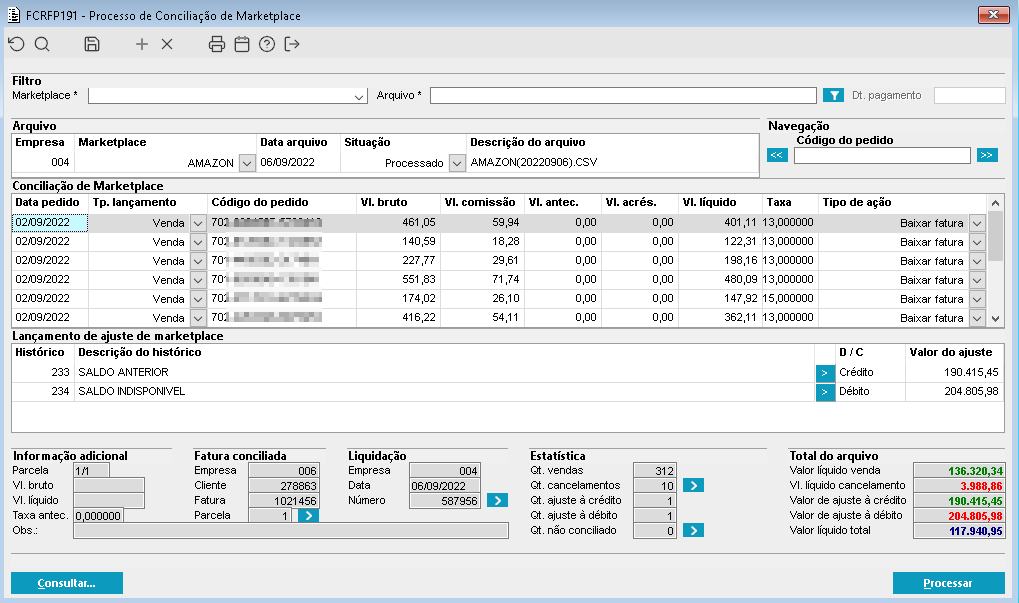 Ainda no componente FCRFP191 após a leitura dos dados do arquivo e verificações necessárias, é necessário clicar no botão Processar para gerar o registro das movimentações no financeiro. Dessa forma, é gerada uma única liquidação do tipo 218 - Marketplace - Baixa de título para o registro das faturas baixadas, assim como a duplicata referente as comissões, o valor creditado em conta corrente (Buscará a conta vinculada a marketplace no componente FCRFM153 para gerar o movimento da empresa logada, se não existir buscará da primeira empresa que encontrar) referente as faturas recebidas e também os valores em conta corrente referente aos ajustes de débito e crédito.