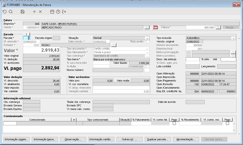 Imagem 2 - Demonstração da fatura baixada pela conciliação manual, após processar no componente FCRFP191, com o valor pago líquido do pedido do marketplace e a diferença sendo lançada como desconto.