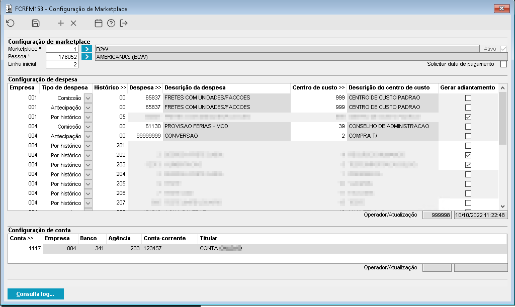 No componente FCRFM153, foi adicionado o novo campo "Gerar adiantamento", que será disponível apenas para a configuração de despesa por histórico para históricos de débito. Esse novo campo, quando marcado, tem a função de gerar a movimentação de adiantamento na conta "Fornecedor" do marketplace com o histórico 1320.