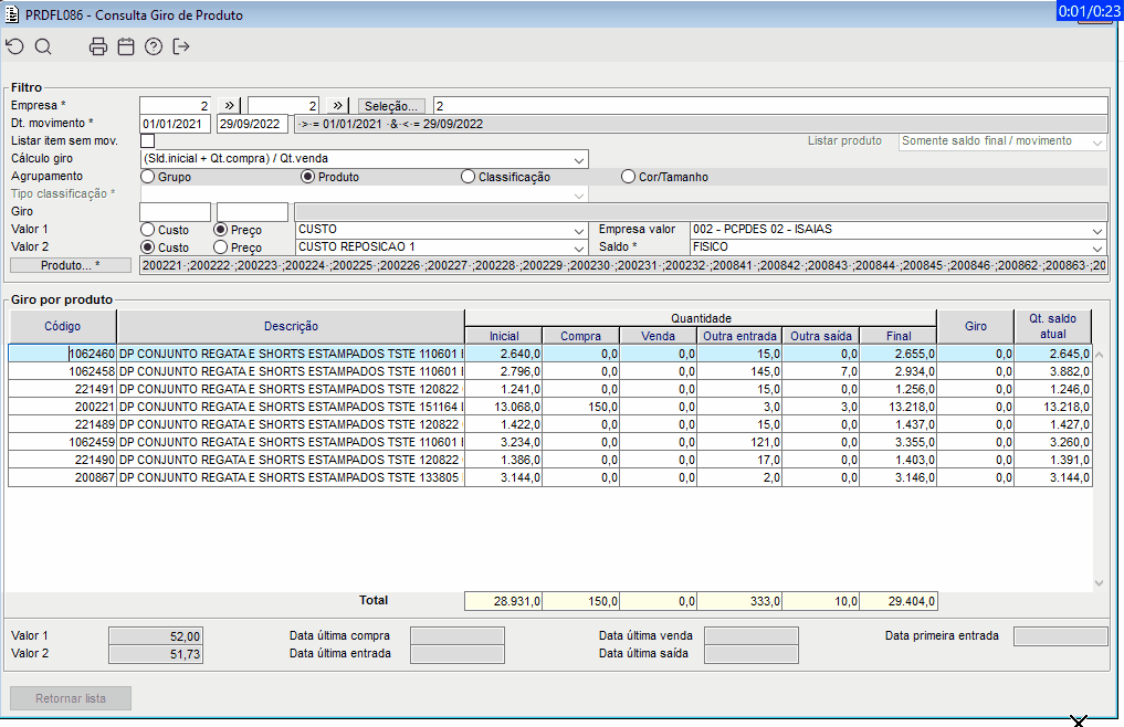Imagem 1 e 2 - Ao acessar o componente PRDFL086 e realizar a impressão para o relatório PRDR148, foram exibidos os campos "Valor1" e "Valor2".