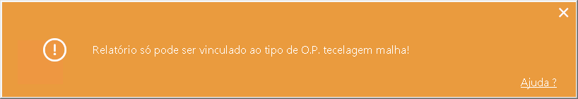 Imagem 02 - Demonstra a mensagem que é apresentada no componente PCPFM170, quando tentado realizar o vínculo do relatório com um tipo de O.P. que não é de "tecelagem malha".