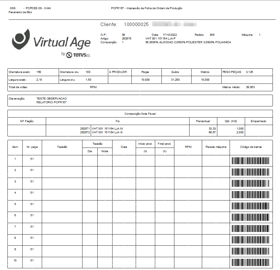 Imagem 05 - Ao acionar o botão mencionado anteriormente, o relatório PCPR167 é apresentado, com as informações da O.P. informada anteriormente.