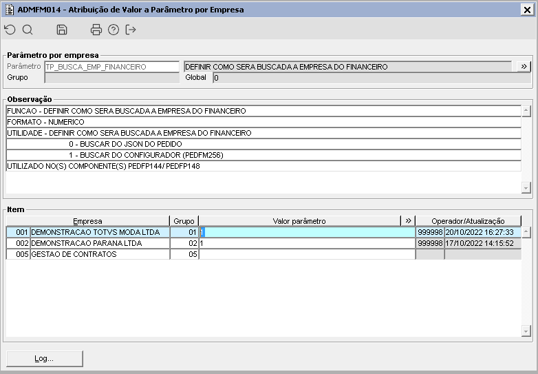 Quando o parâmetro TP_BUSCA_EMP_FINANCEIRO estiver com valor 1, o financeiro será gerado na empresa configurada no PEDFM256 ao realizar o aceite do pedido de venda pelo componente PEDFP144.