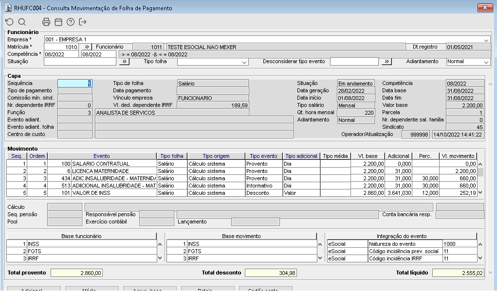 Imagem 1 - Demonstração da folha calculada para a competência 08/2022 da matrícula 1010.