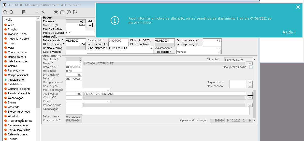 Imagem 4 - Demonstração da solicitação do motivo da alteração do afastamento.