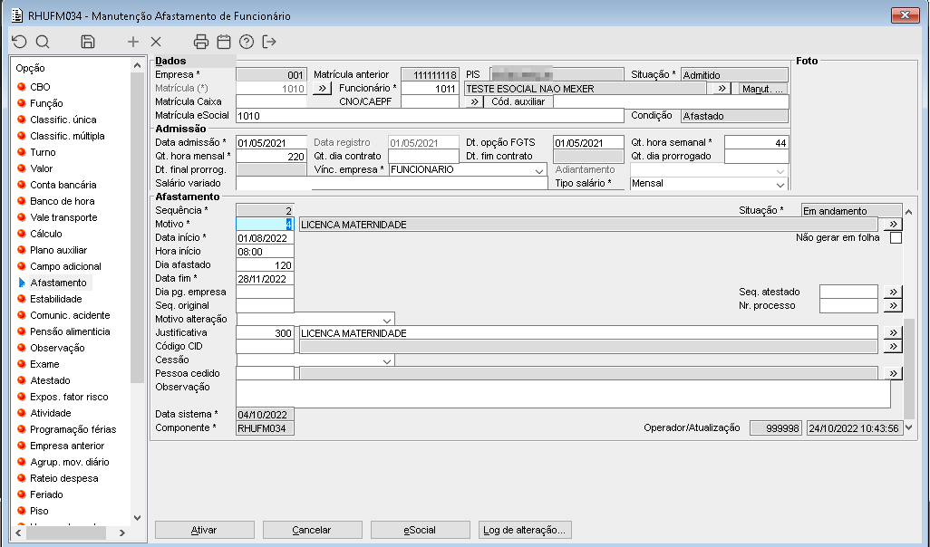 | Função: | RHUM029→RHUFM034 - Alteração de período de afastamento com movimento de folha para o período. |