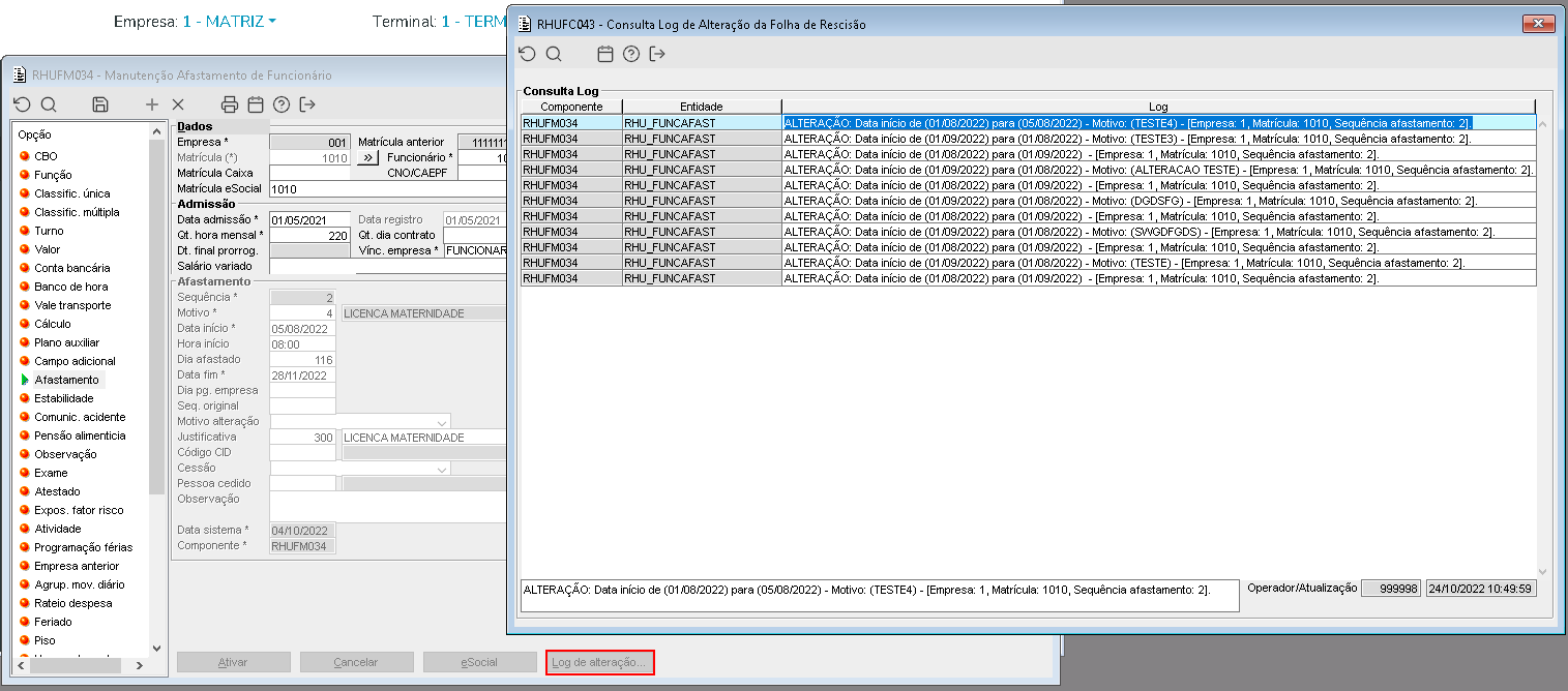 Imagem 7 - Demonstração dos dados de log contendo os motivos da alteração do afastamento, acessado pelo botão "Log de alteração" no mesmo componente RHUFM034.