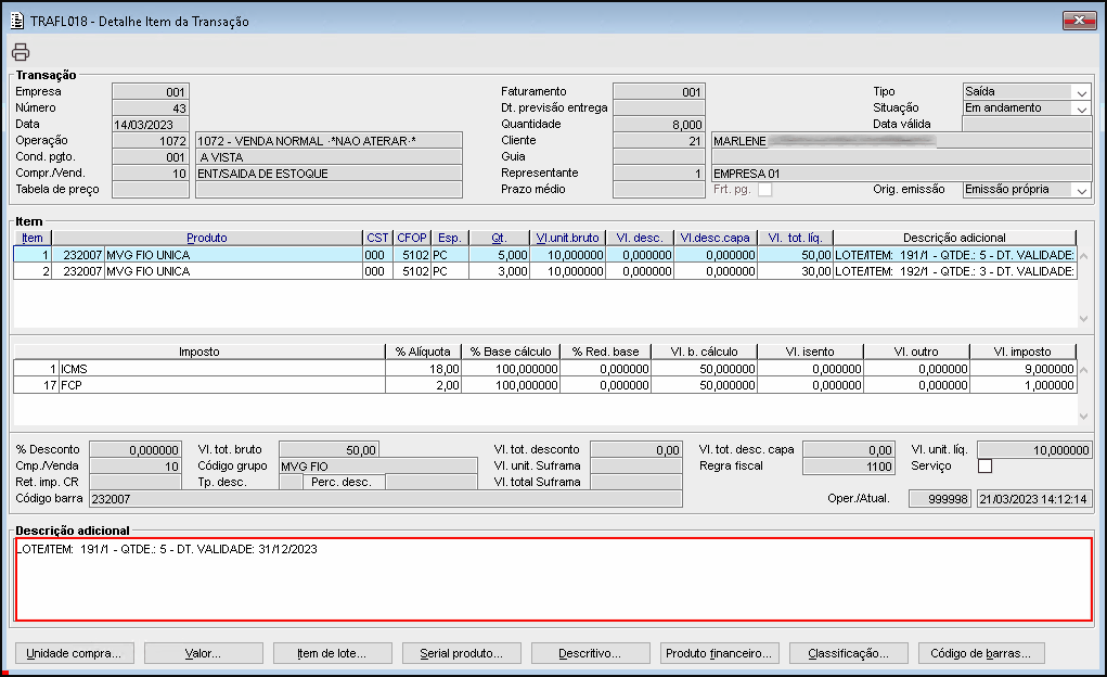 Imagem 04 - Ao acionar o botão mencionado anteriormente, o componente TRAFL018 é apresentado, onde pode ser visto o item da transação e pode ser visto no campo "Descrição adicional" pode ser visto o código do lote, a quantidade e a data de validade informada anteriormente.