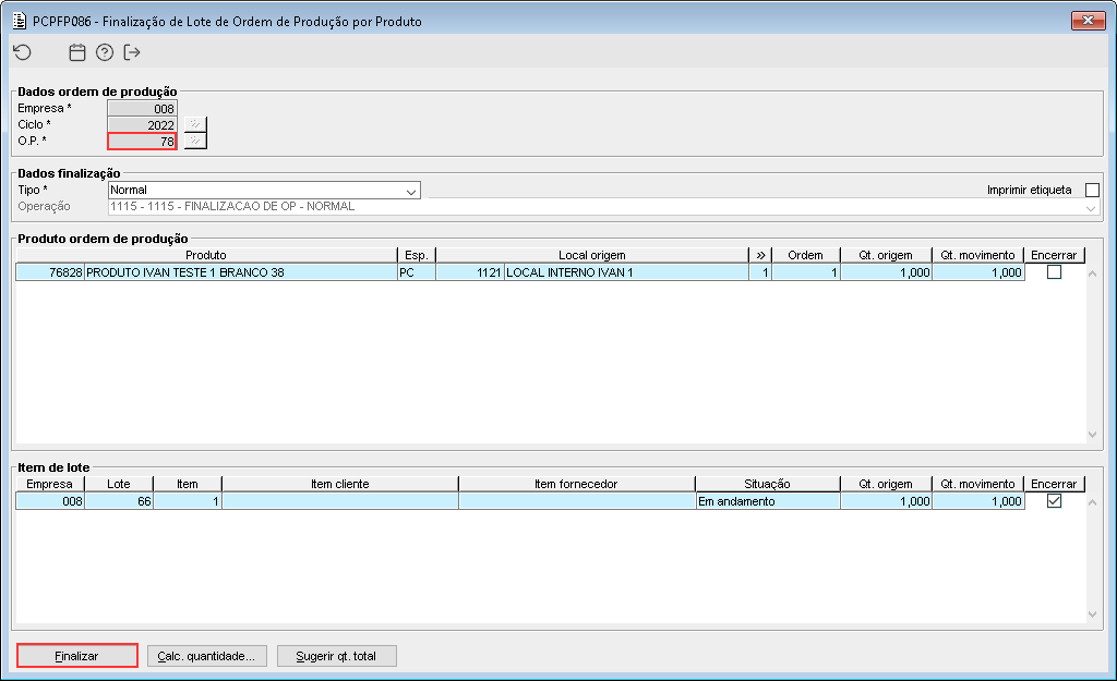 Imagem 05 - Demonstra o componente PCPFP086, onde está sendo informada a O.P. "78" e em seguida informada a quantidade de movimento e marcada a opção "Encerrar" e em seguida está sendo acionado o botão "Finalizar".