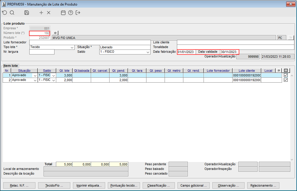 Imagem 03 - Demonstra o componente PRDFM059, onde está sendo criado o lote "192" para o produto "232007" onde pode ser visto que o mesmo possui dois itens e a data de validade é dia: "30/11/2023".