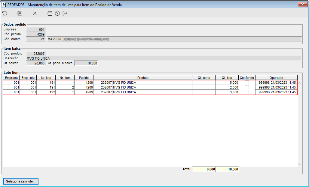 Imagem 04 - Pode ser visto que para o item "232007" do pedido de venda "4207" foram adicionados três itens de lote.