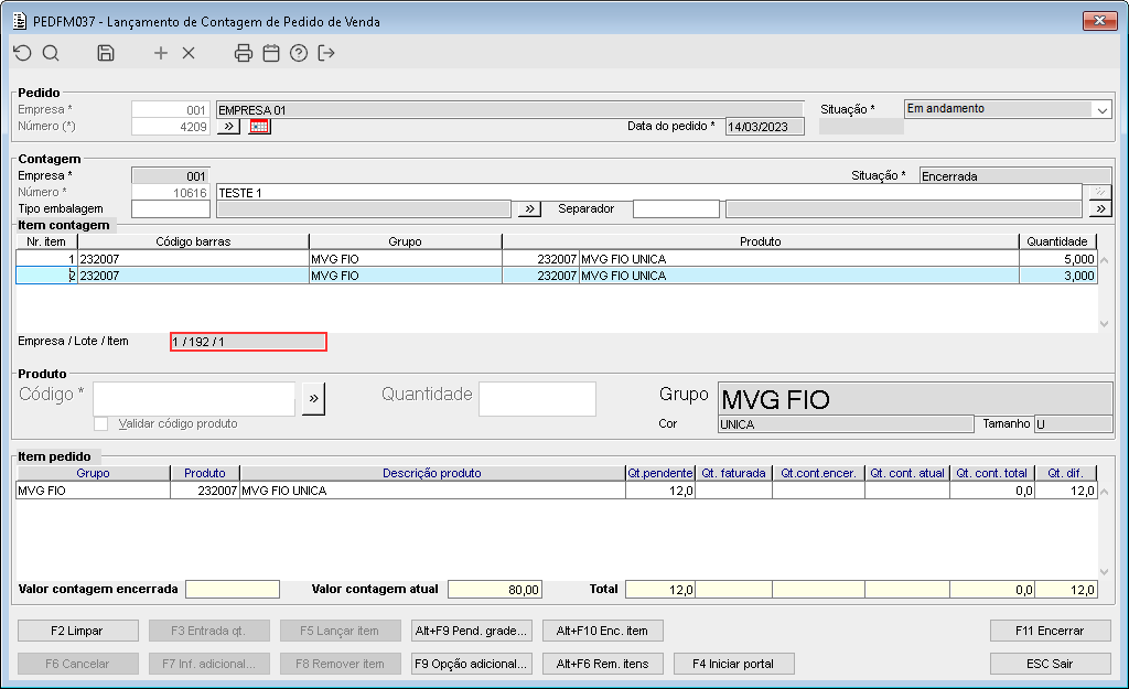 Imagem 06 - Demonstra o componente PEDFM037, onde está sendo criada a contagem "10616" onde pode ser visto que o item da contagem "2" é referente ao lote "192".