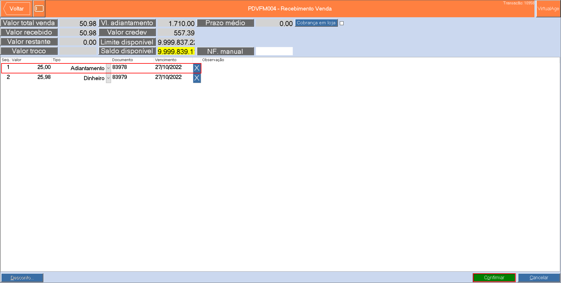 Imagem 02 - Demonstra o componente PDVFM004, onde está sendo informado dois tipos de pagamento sendo eles: "Adiantamento" e "Dinheiro". Em seguida está sendo acionado o botão "Confirmar" e realizado o encerramento da transação.