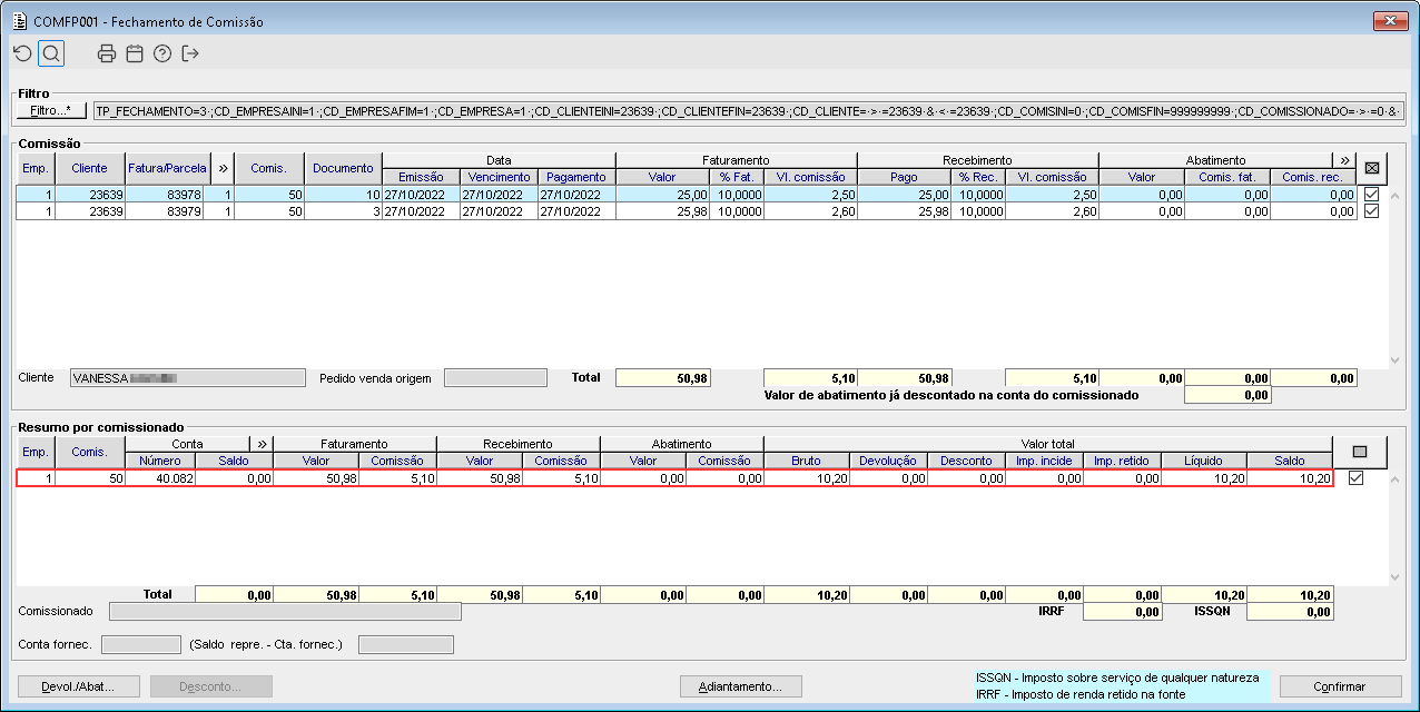 Imagem 03 - Demonstra o componente COMFP001, onde está sendo consultada as informações referente a transação criada anteriormente, e no campo "Resumo por comissionado" pode ser visto que para o comissionado "50" a comissão foi gerada corretamente.