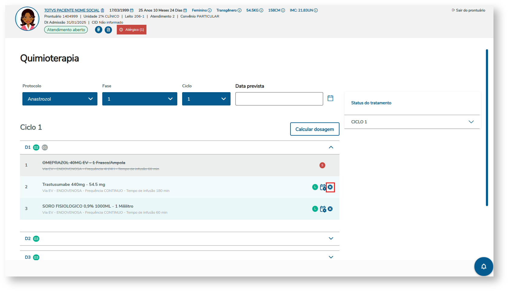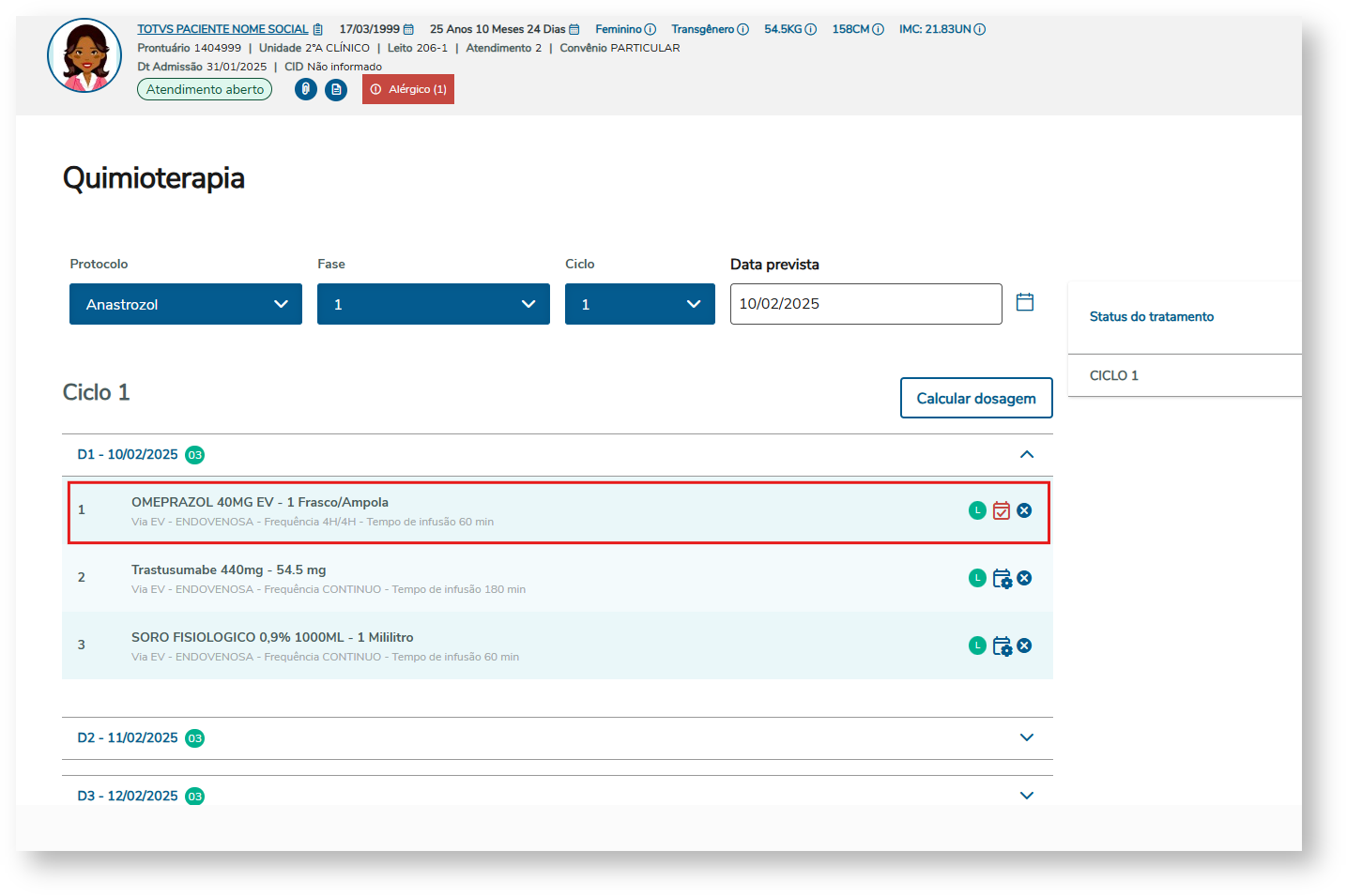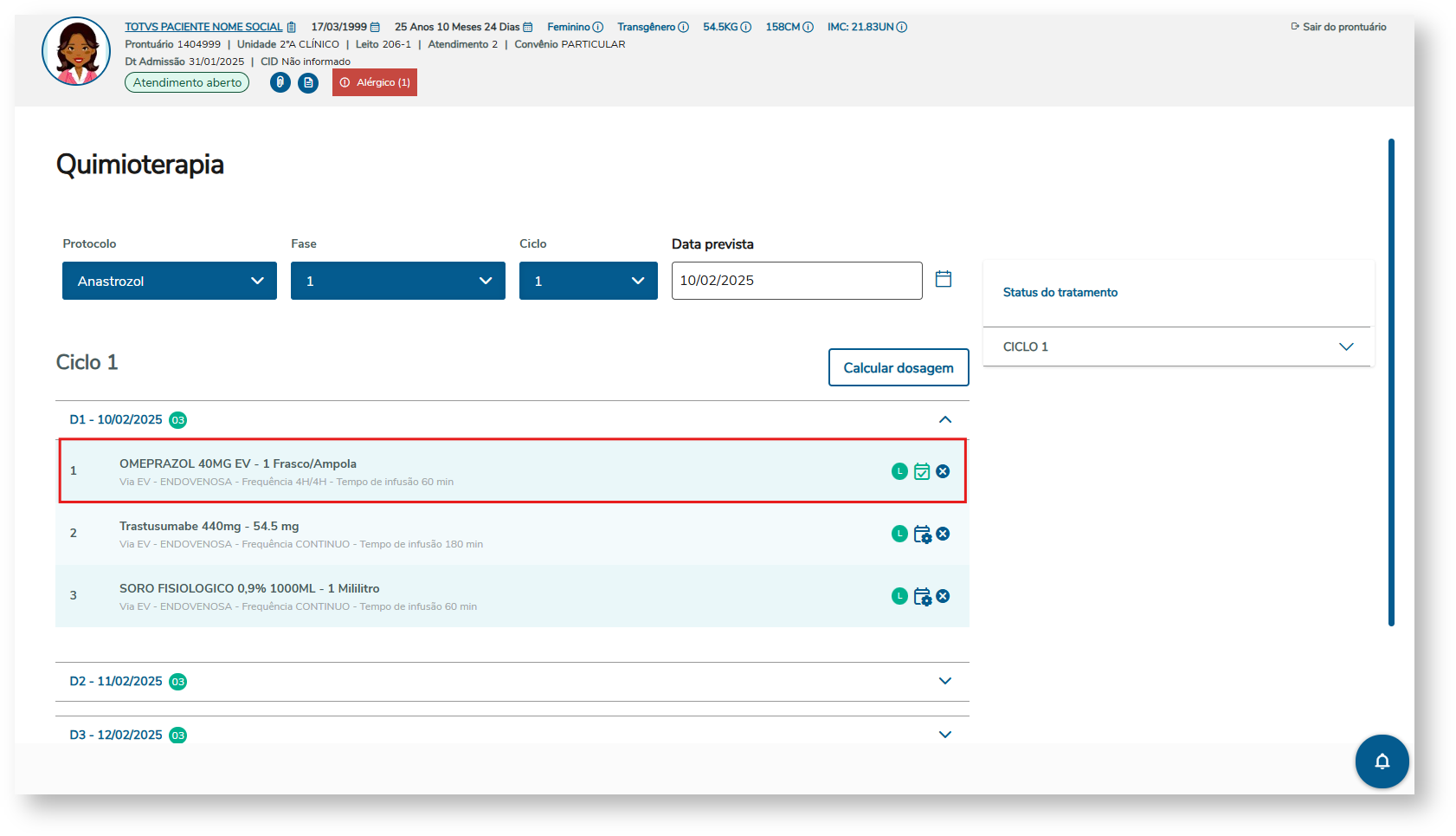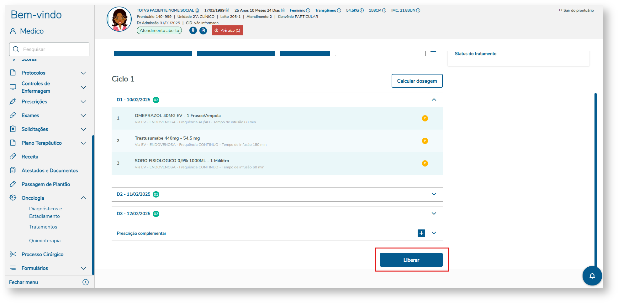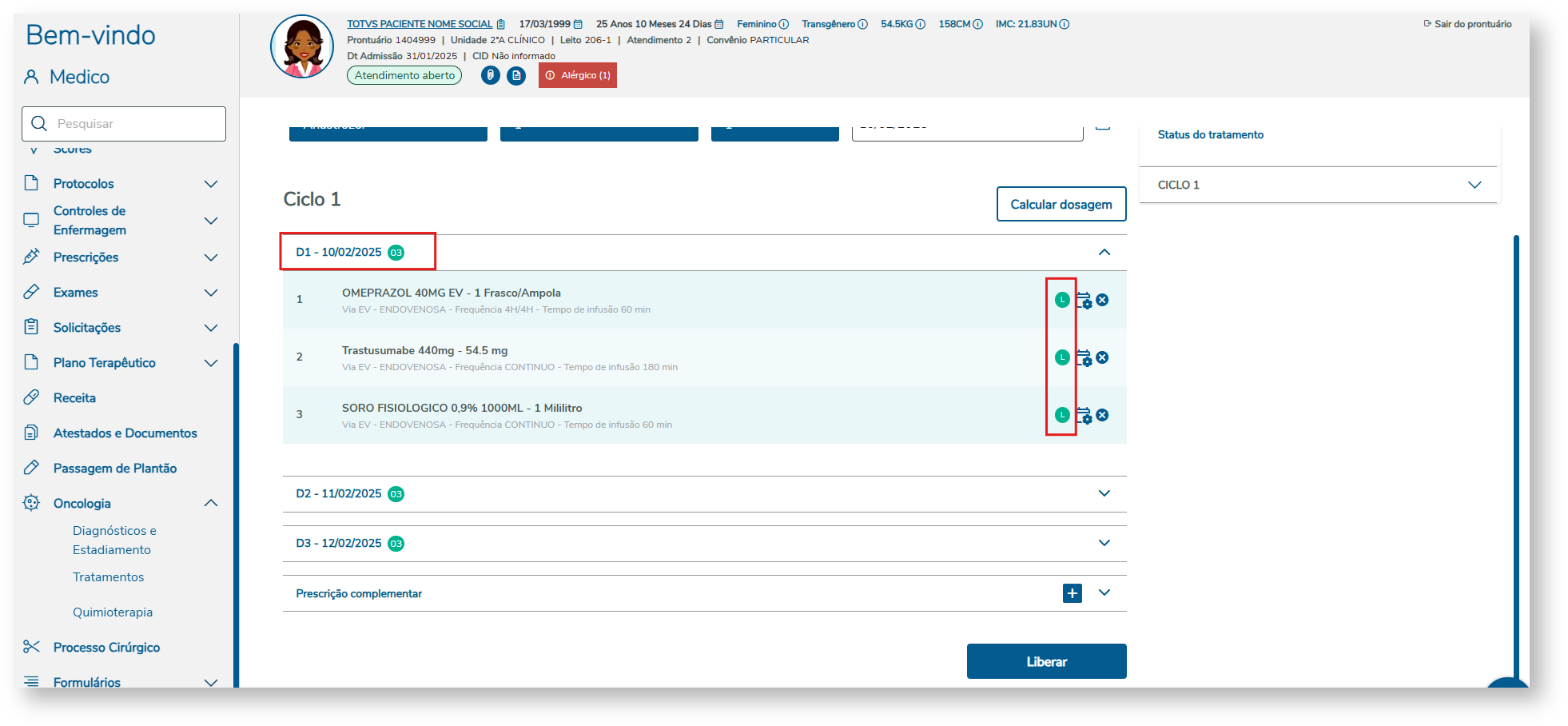 Ao acessar a tela de "Quimioterapia" e selecionar o protocolo, fase e ciclo atual, serão listados os itens prescritos com o devido status.