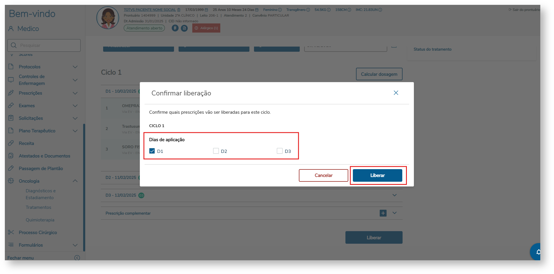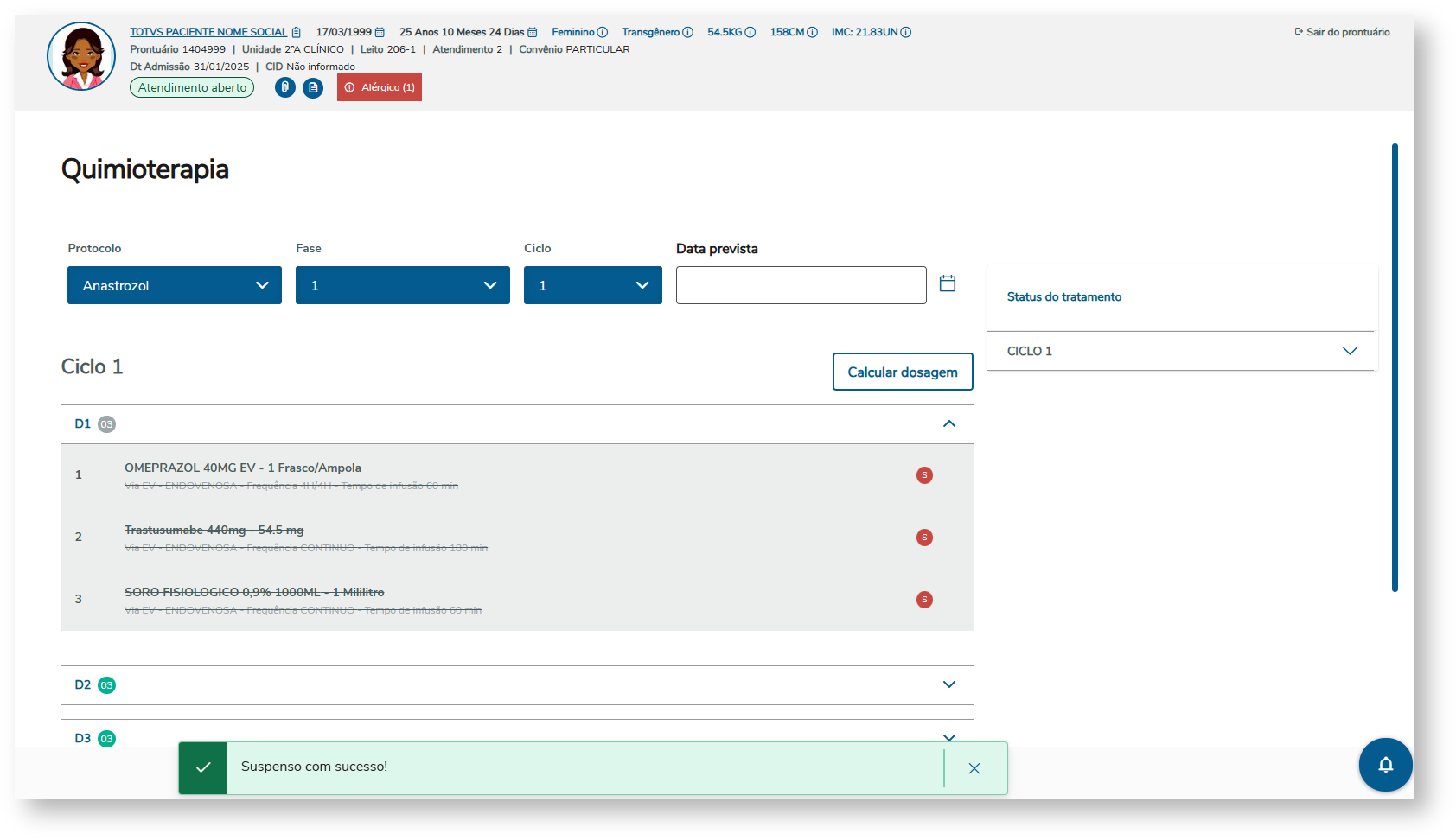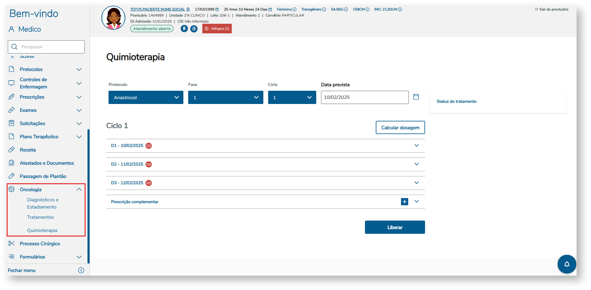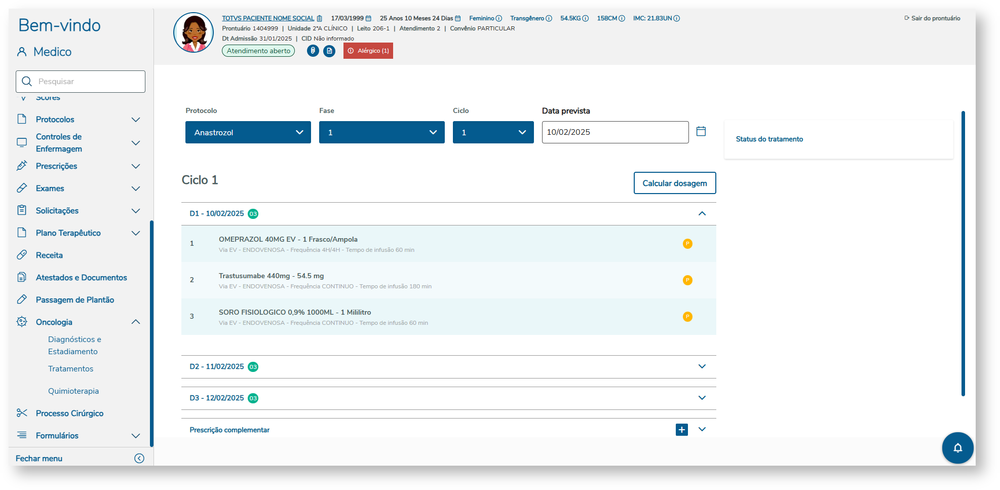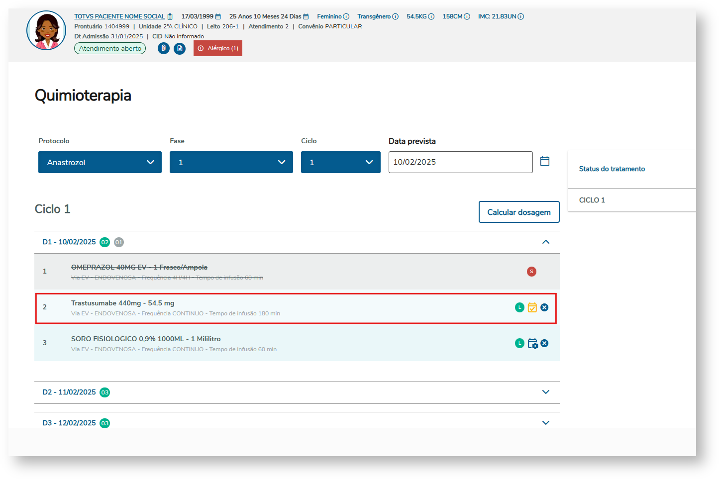 Ao acessar a tela de "Quimioterapia" e selecionar o protocolo, fase e ciclo atual, serão listados os itens prescritos com o devido status.