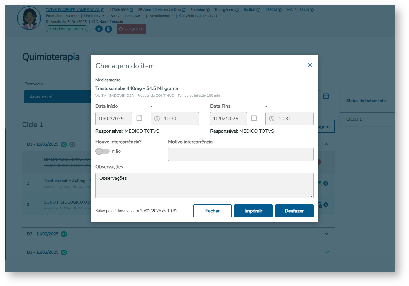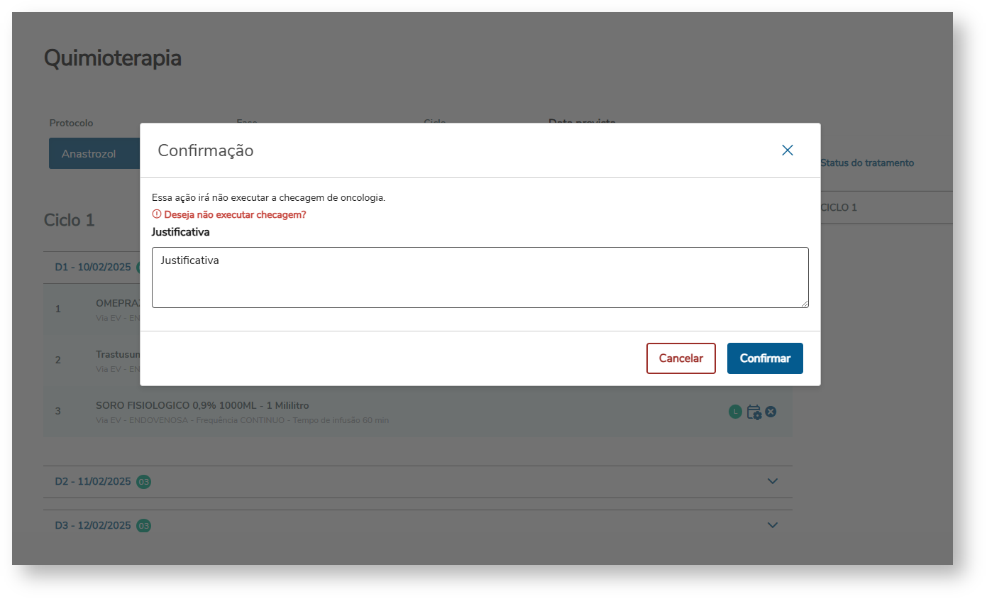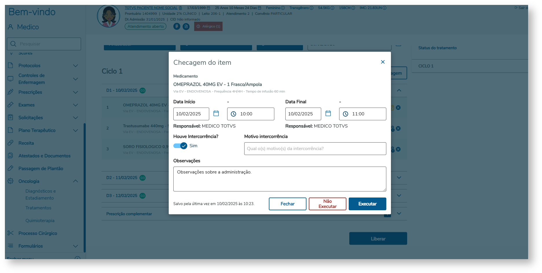 A checagem de oncologia permite que os usuários registrem o início e término da administração dos medicamentos, bem como adicionar observações relevantes sobre o tratamento. O campo para registrar observações não é obrigatório e pode ser utilizado para informar intercorrências, caso o paciente apresente alguma reação adversa durante a administração do medicamento.