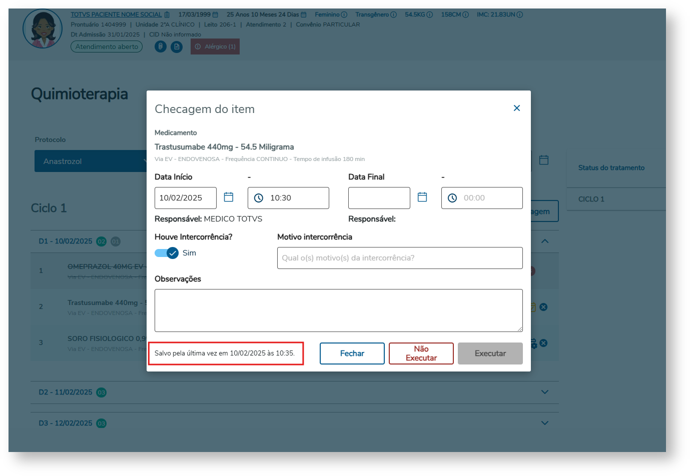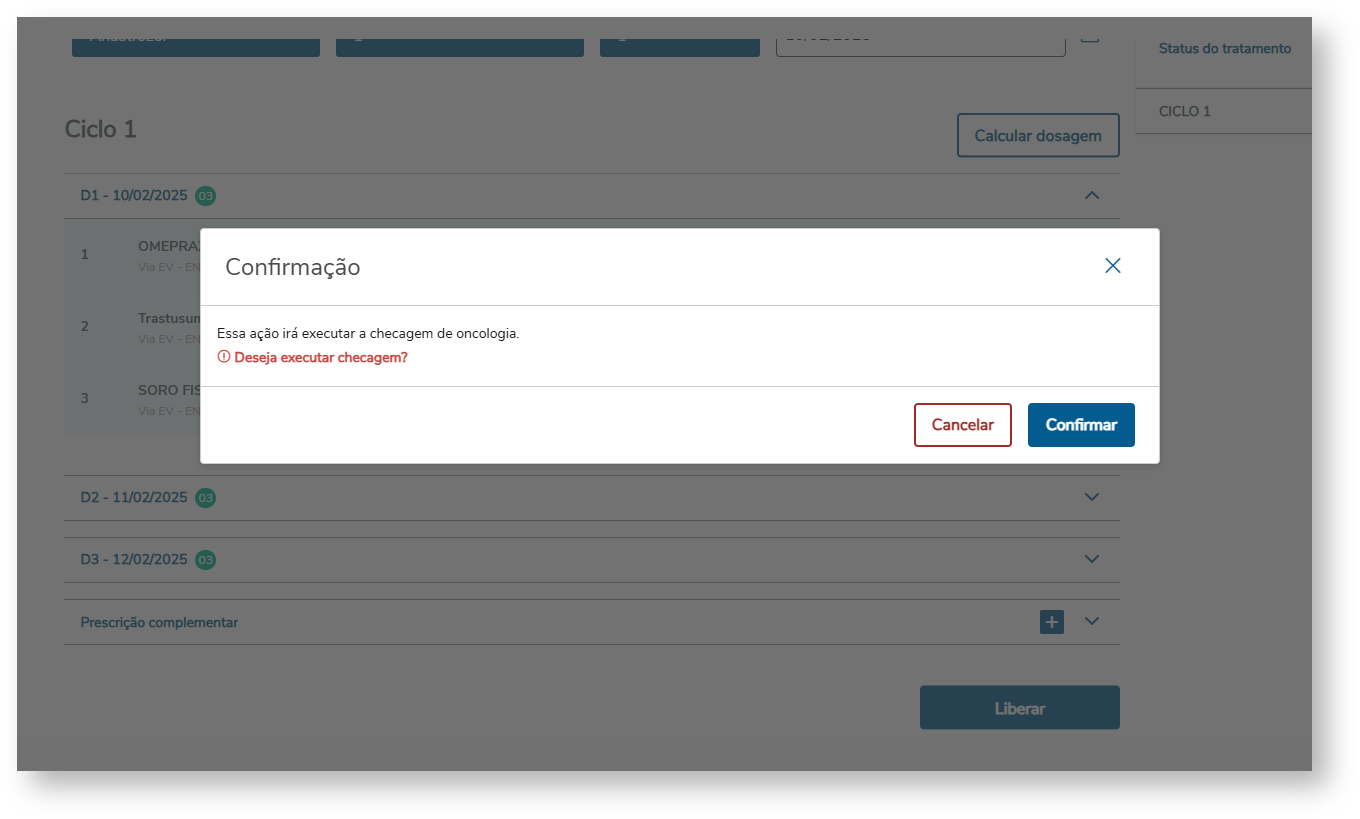 a. Após todos os itens prescritos do dia no ciclo em questão estiverem com a checagem finalizada (EXECUTAR/NÃO EXECUTAR) o status do tratamento do dia do ciclo deverá ser atualizado para "Checagem Concluída".