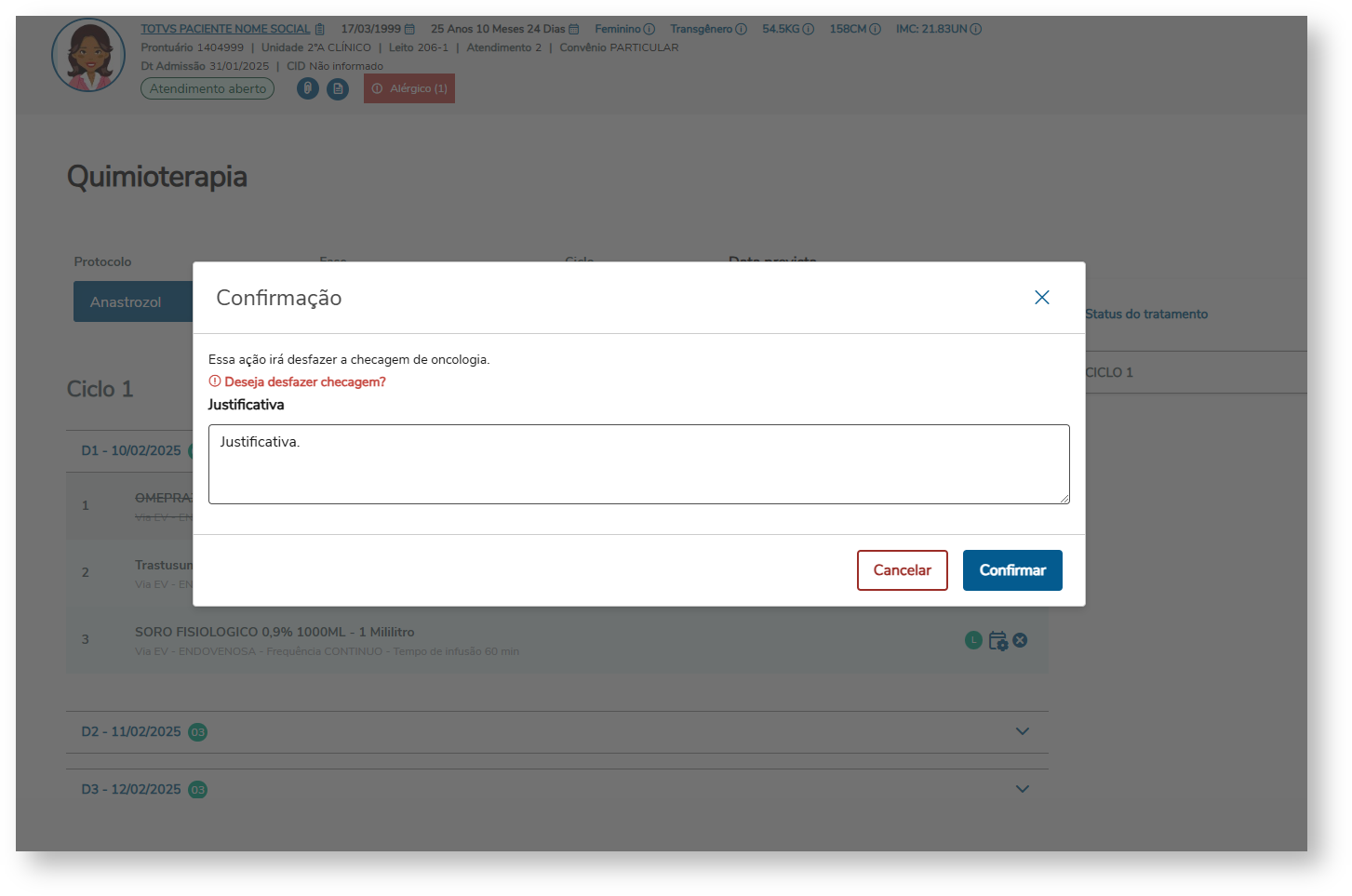 Essa ação desfaz as checagens anteriores. Também é necessário informar uma justificativa para desfazer a checagem realizada anteriormente. Após a confirmação, o medicamento ficará disponível para checagem novamente.