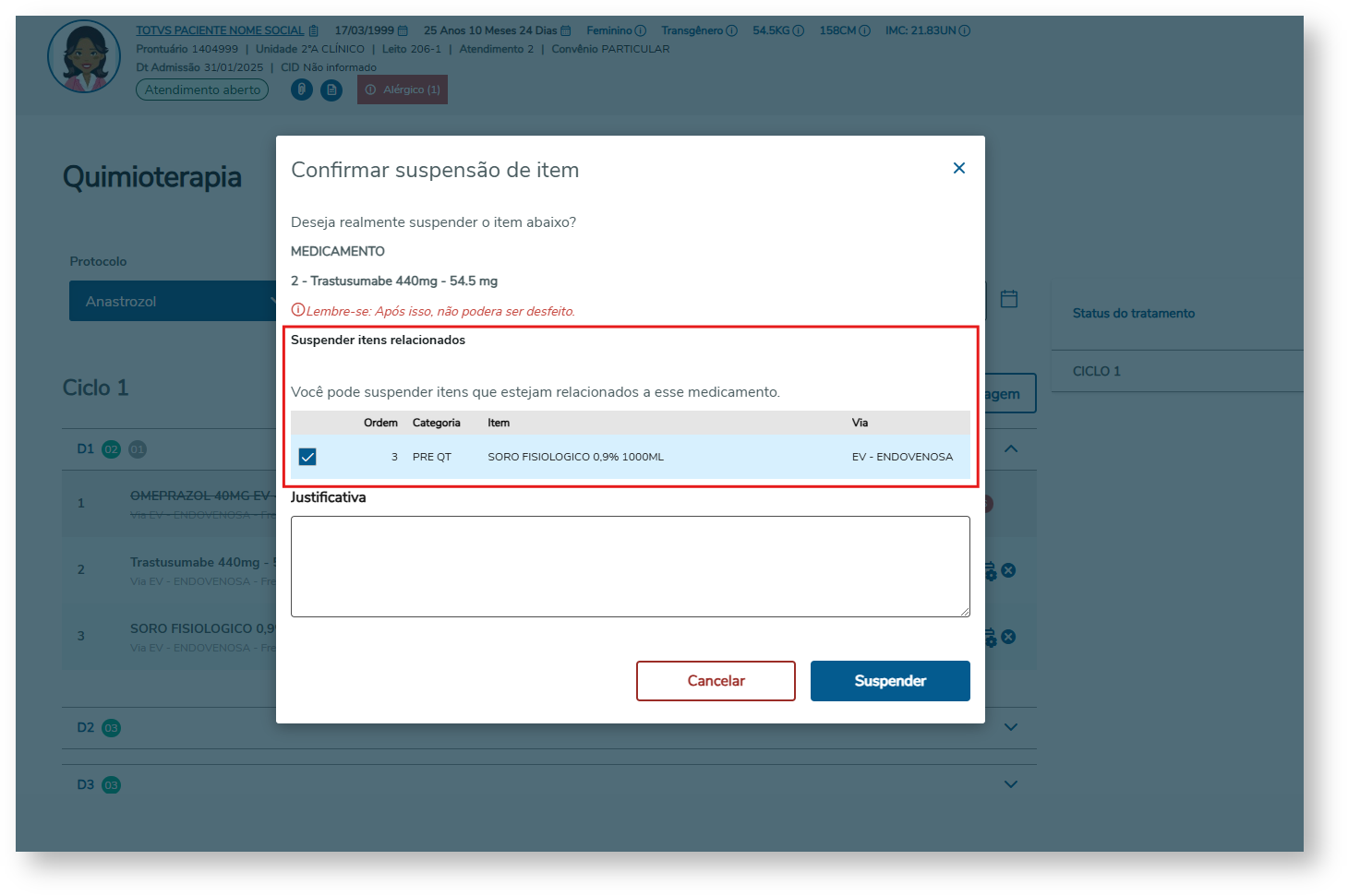 Para suspender uma medicação, clique no ícone "X" do respectivo medicamento. Uma modal será exibida para confirmação e preenchimento de justificativa. O usuário poderá também suspender os itens associados ao medicamento marcando o respectivo checkbox, se necessário.