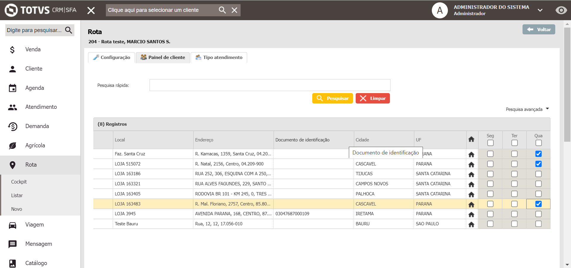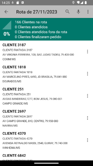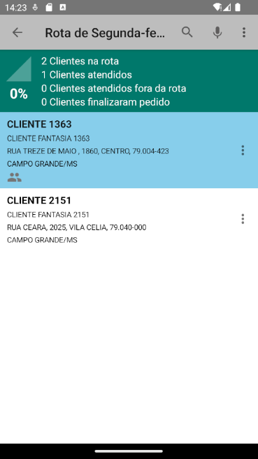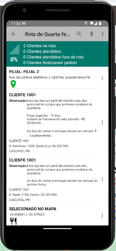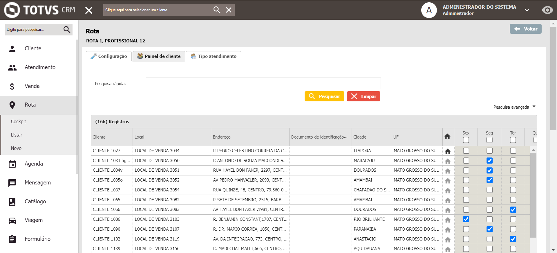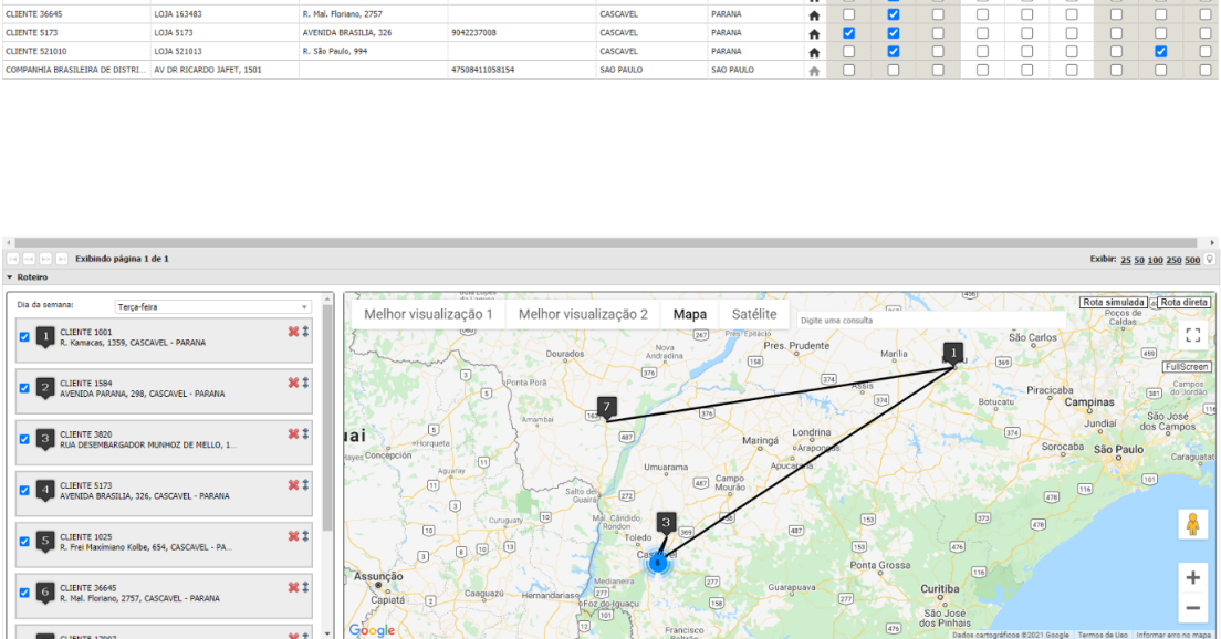 Em seguida, ao selecionar a Rota e o Dia, são exibidos os clientes que ele fará o atendimento: