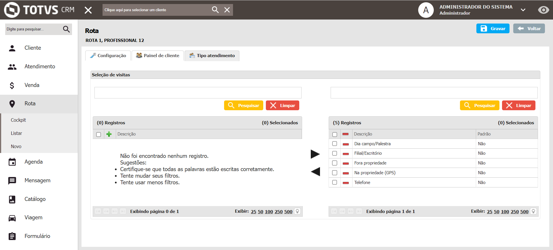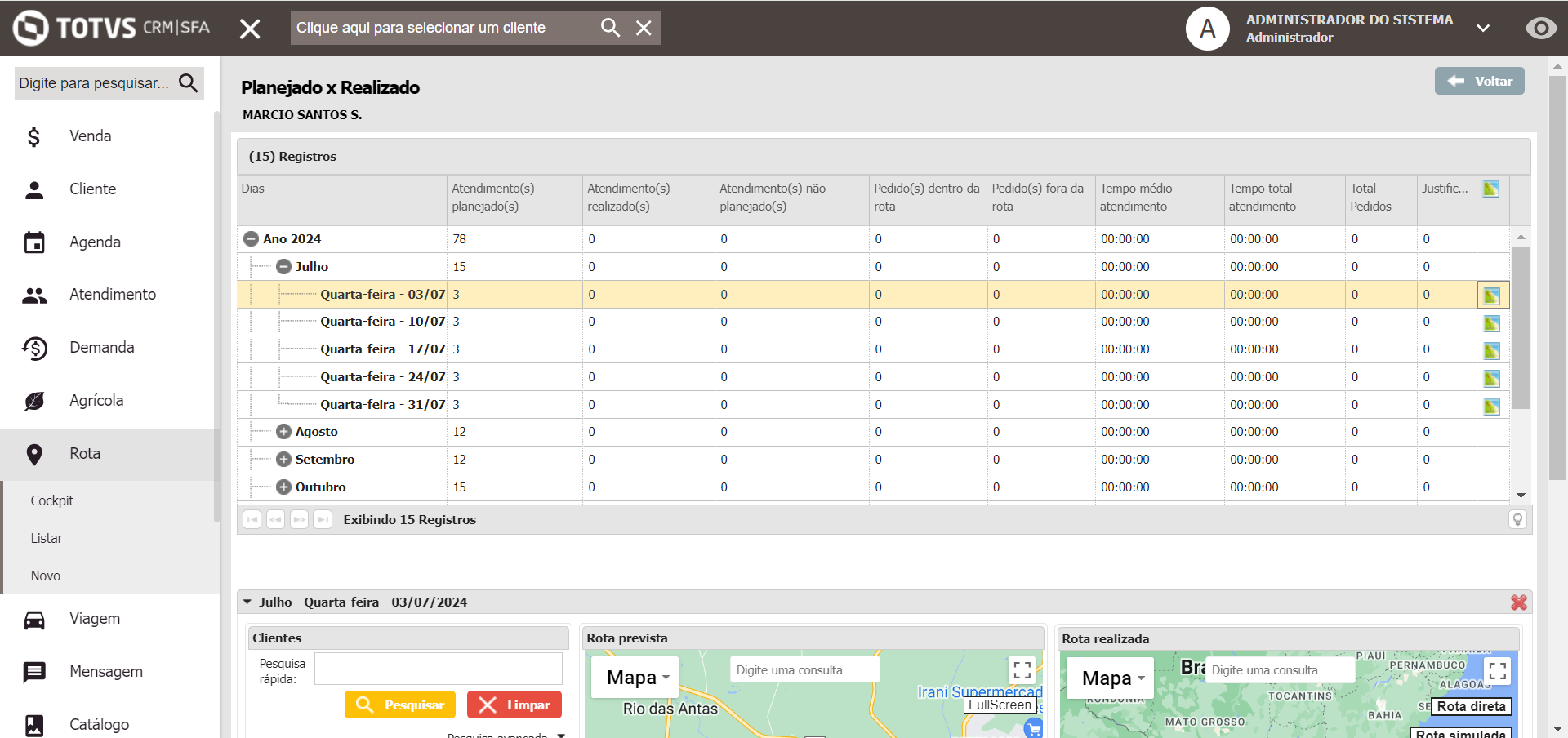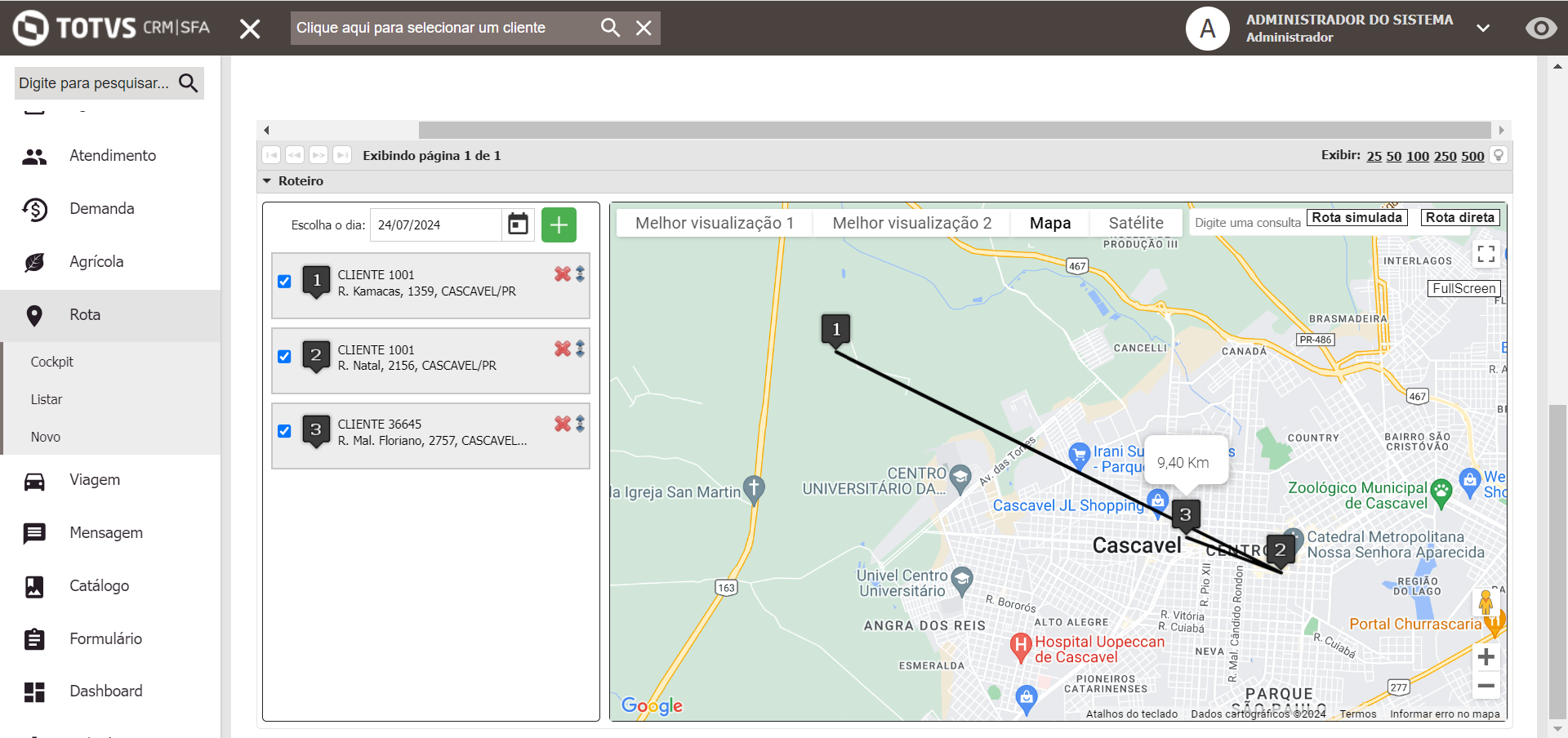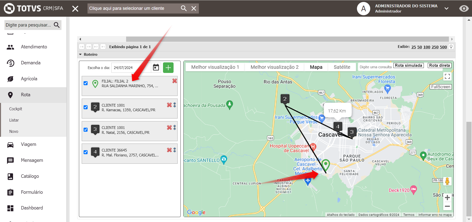 Em seguida, ao selecionar a Rota e o Dia, são exibidos os clientes que ele fará o atendimento: