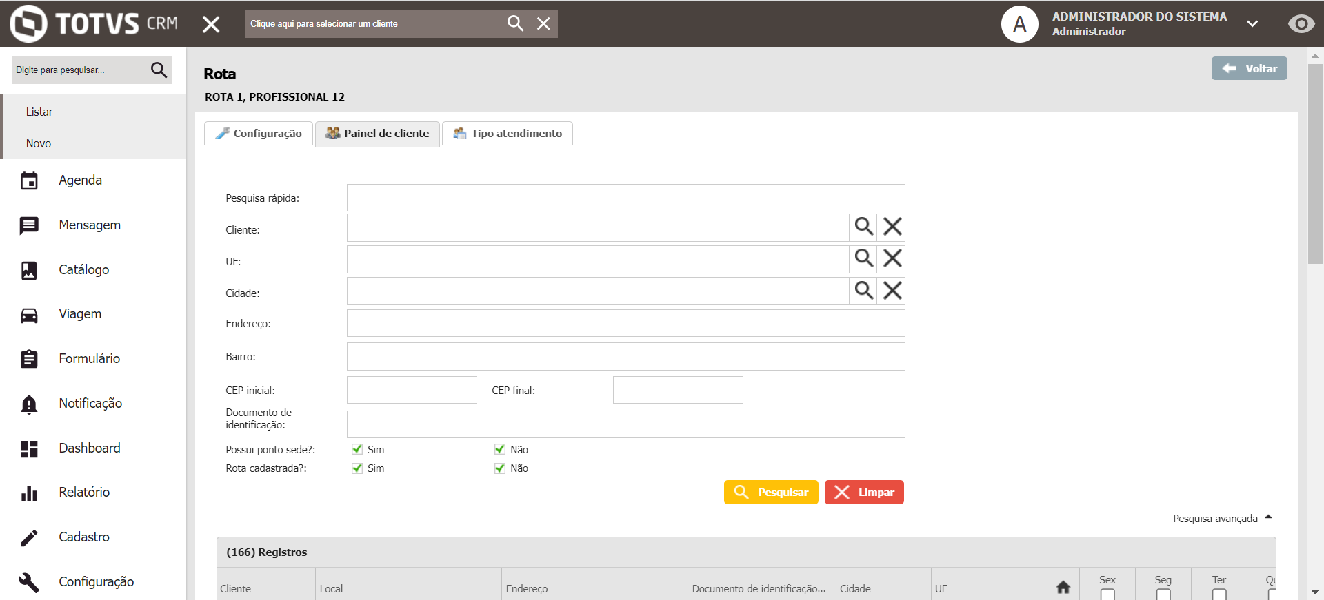 Na Aba "Painel de Cliente" é exibido todos os clientes disponíveis para incluir na Rota do Profissional selecionado:
